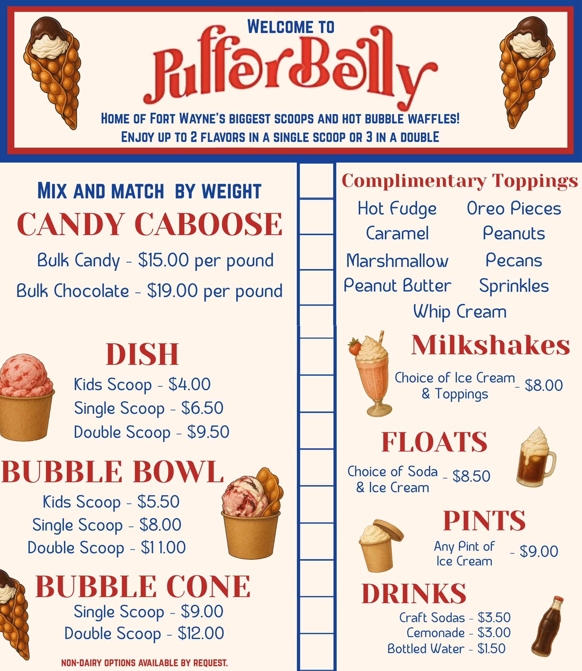 • Bubble Bowl – A half-sized waffle nestled into a dish, filled with your favorite ice cream flavors and your choice of toppings.